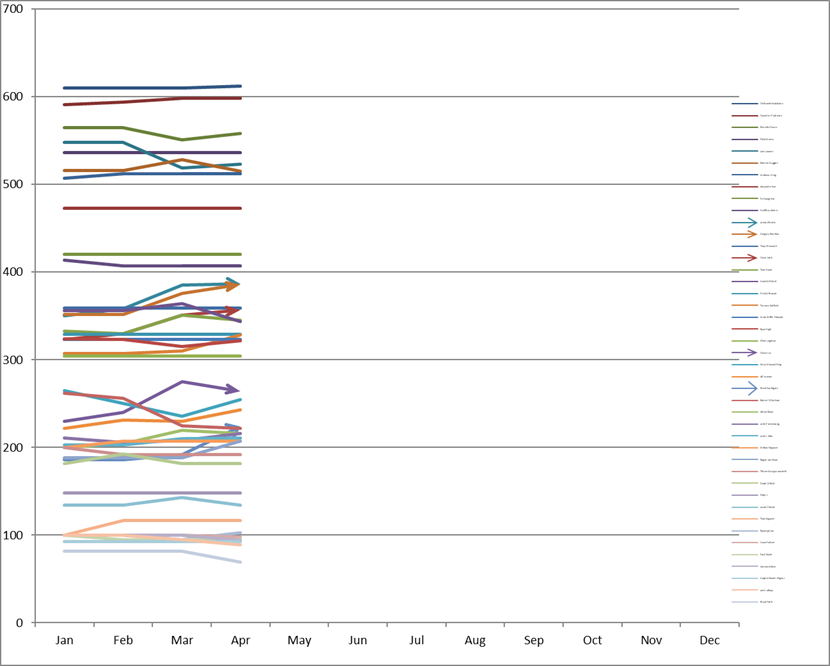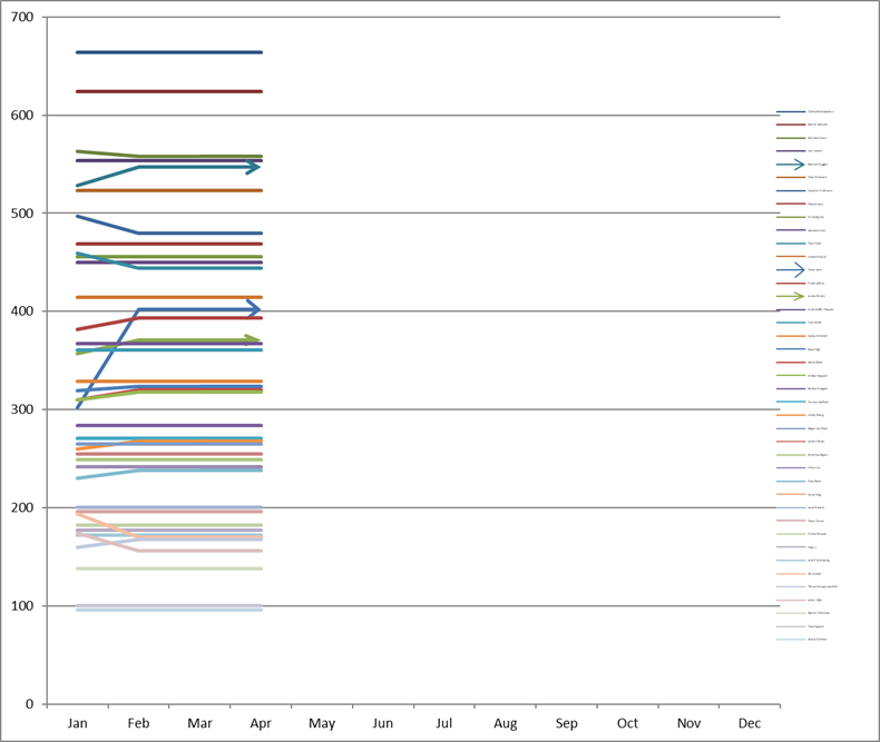 | Rank | Name | Jan | Feb | Mar | Apr | May | Jun | Jul | Aug | Sep | Oct | Nov | Dec | Gain | Rank | Name | Jan | Feb | Mar | Apr | May | Jun | Jul | Aug | Sep | Oct | Nov | Dec | Gain | Rank | Name | Jan | Feb | Mar | Apr | May | Jun | Jul | Aug | Sep | Oct | Nov | Dec | Gain | |||||